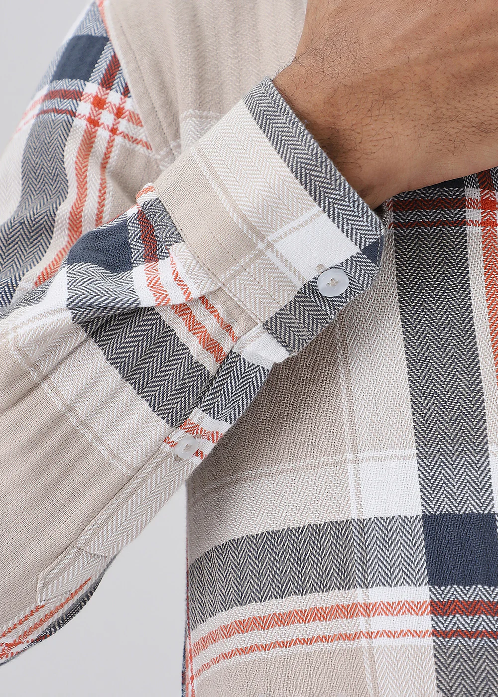 - A full sleeves checkered shirt with a regular collar.