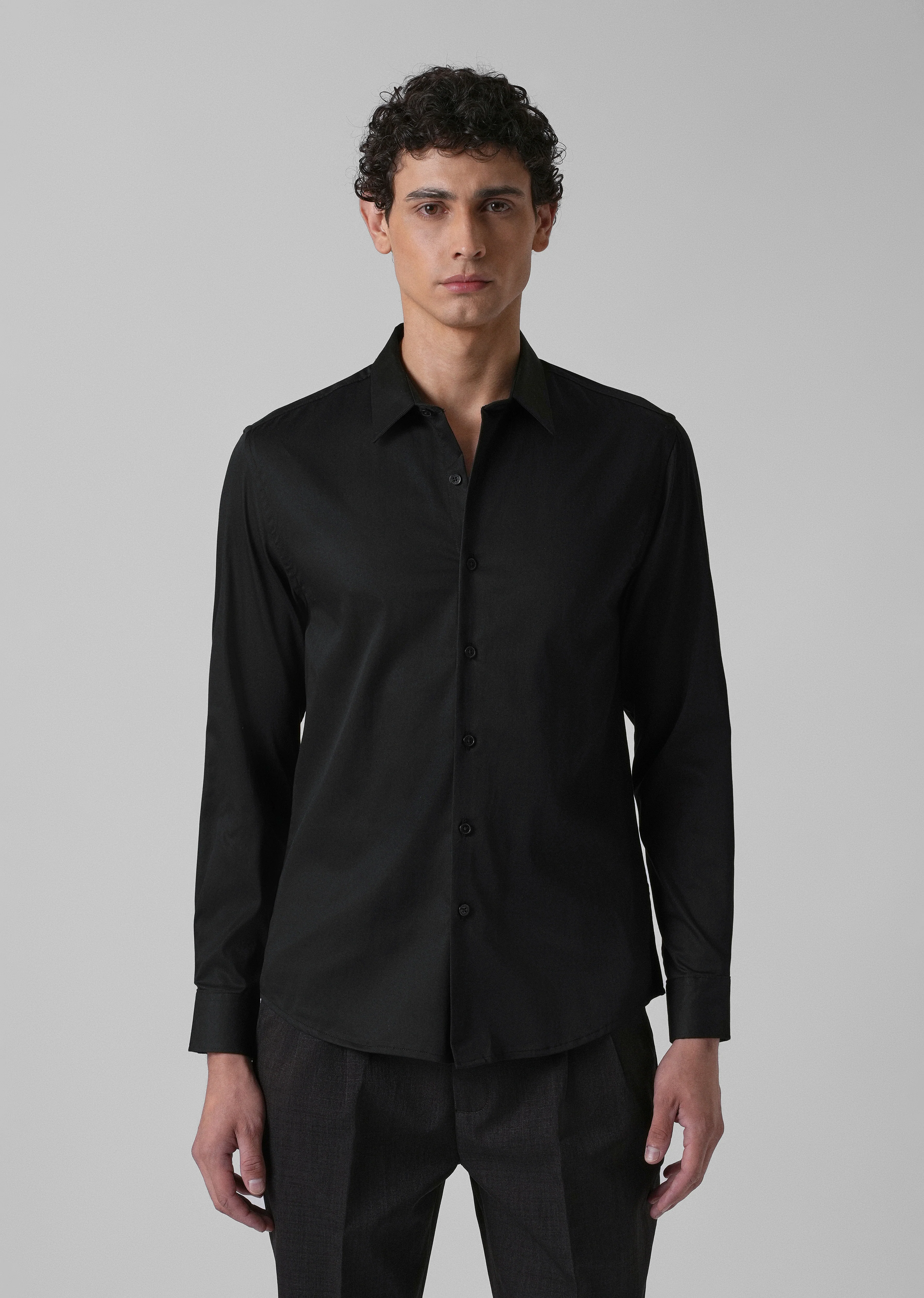 - Curved hem design with spread collar.